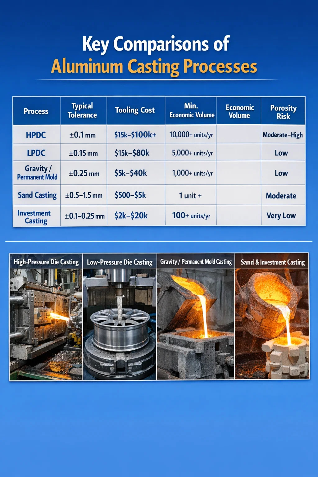 | LPDC | ±0,15 mm | $15.000-$80.000 | 5.000 enheder/år | Lav |