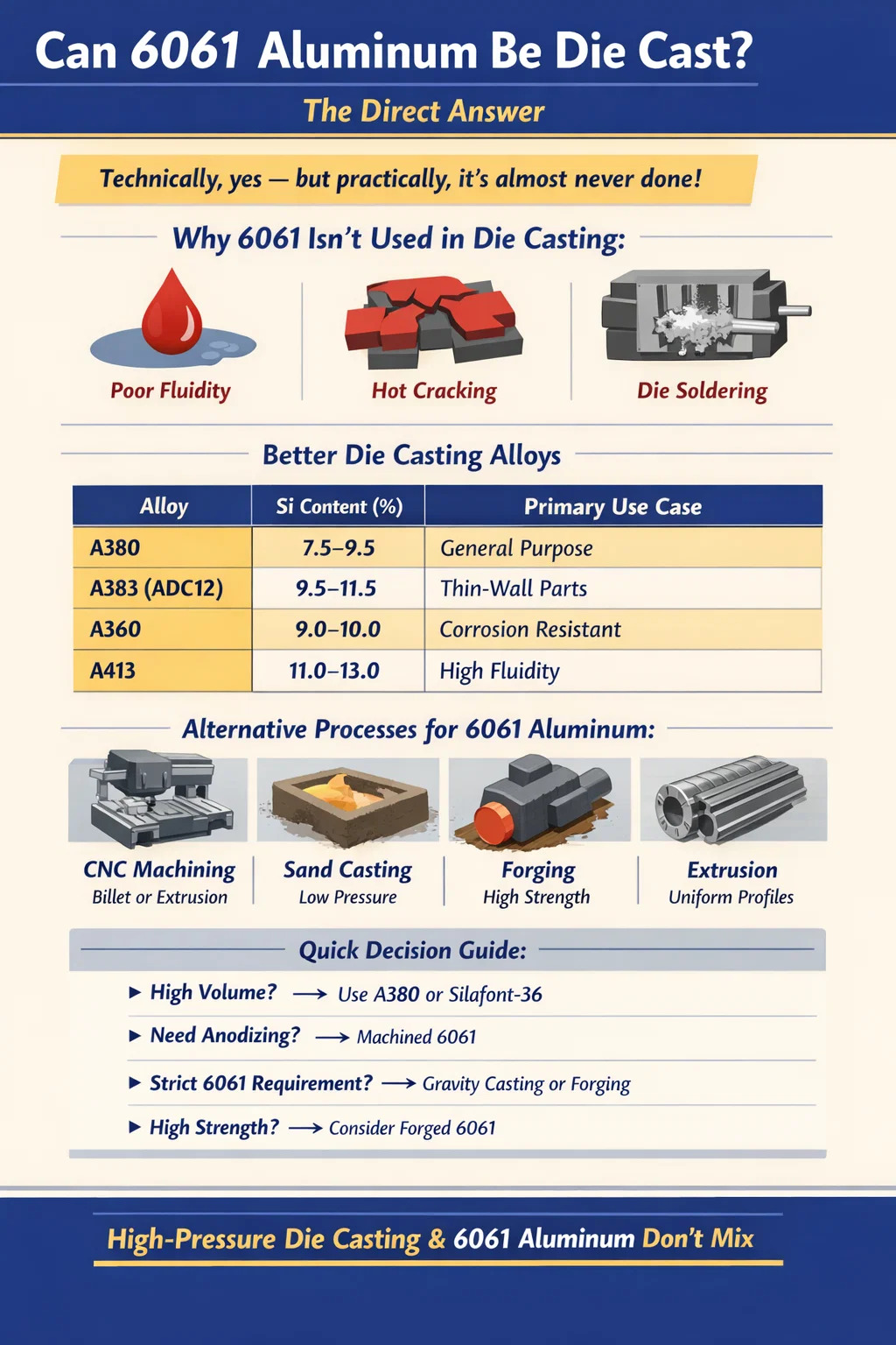 Den praktiske takeaway er, at hvis trykstøbning specifikt betyder HPDC - hvilket det gør i de fleste industrielle samtaler - så bør 6061 undgås. Hvis lavtryks- eller gravitationsprocesser er inden for rammerne, bliver 6061 en levedygtig mulighed, især for strukturelle dele, der kræver T6 varmebehandling.