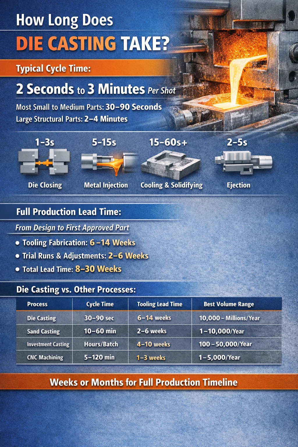 Det tal for cyklustiden fortæller kun en del af historien. Før den første gode del ruller af linjen, involverer en trykstøbningsoperation værktøjsfabrikation (som kan tage 6-14 uger), maskinopsætning, matriceforvarmning, prøveskud og dimensionsvalidering. Fra råt design til godkendt produktionsdel måles den fulde tidslinje i uger eller måneder, ikke sekunder.
