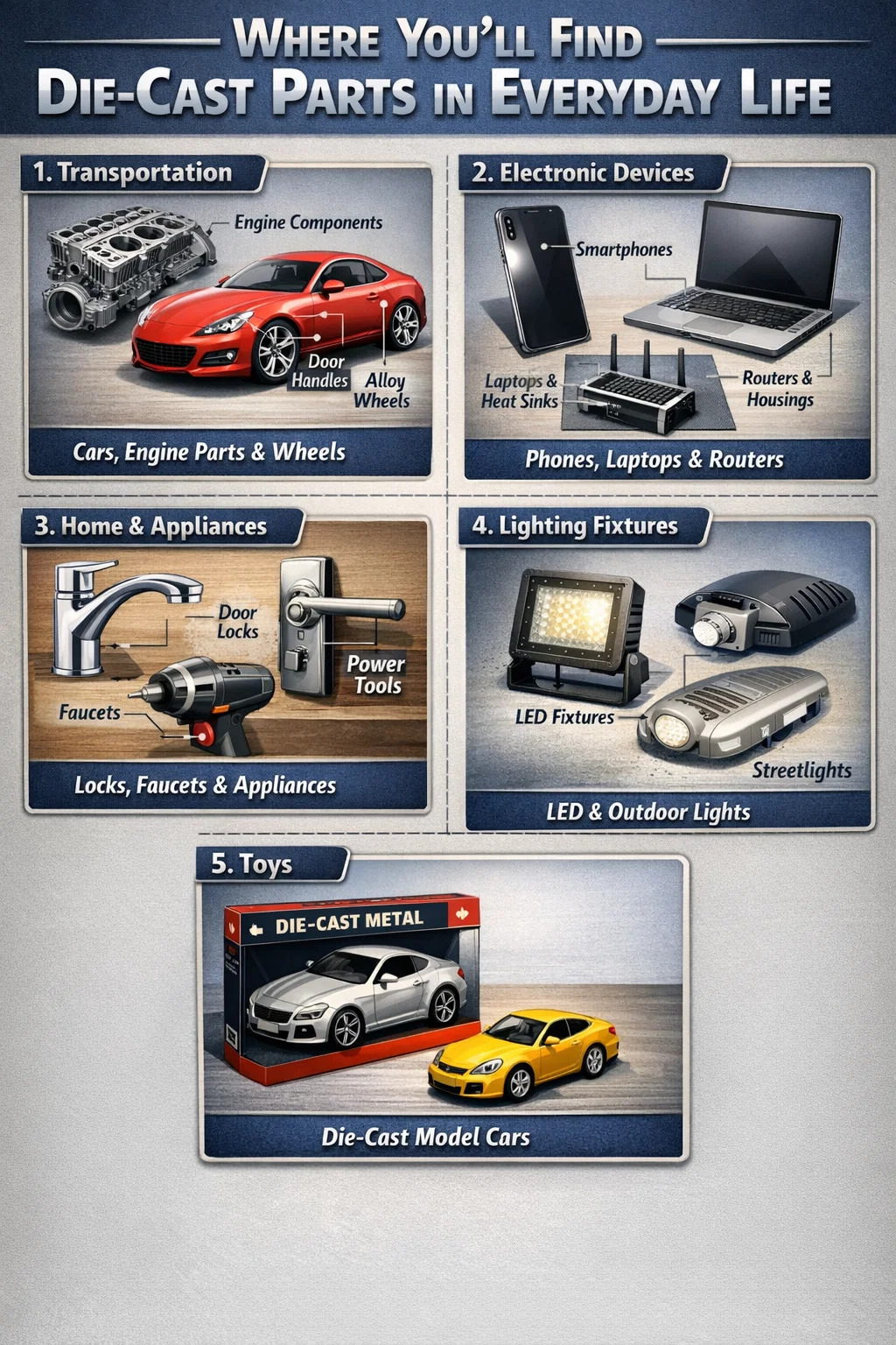 Trykstøbning bruges primært til at fremstille varer, der kræver holdbarhed, præcise former og masseproduktion. Her er nogle af de mest almindelige anvendelser i vores daglige liv: