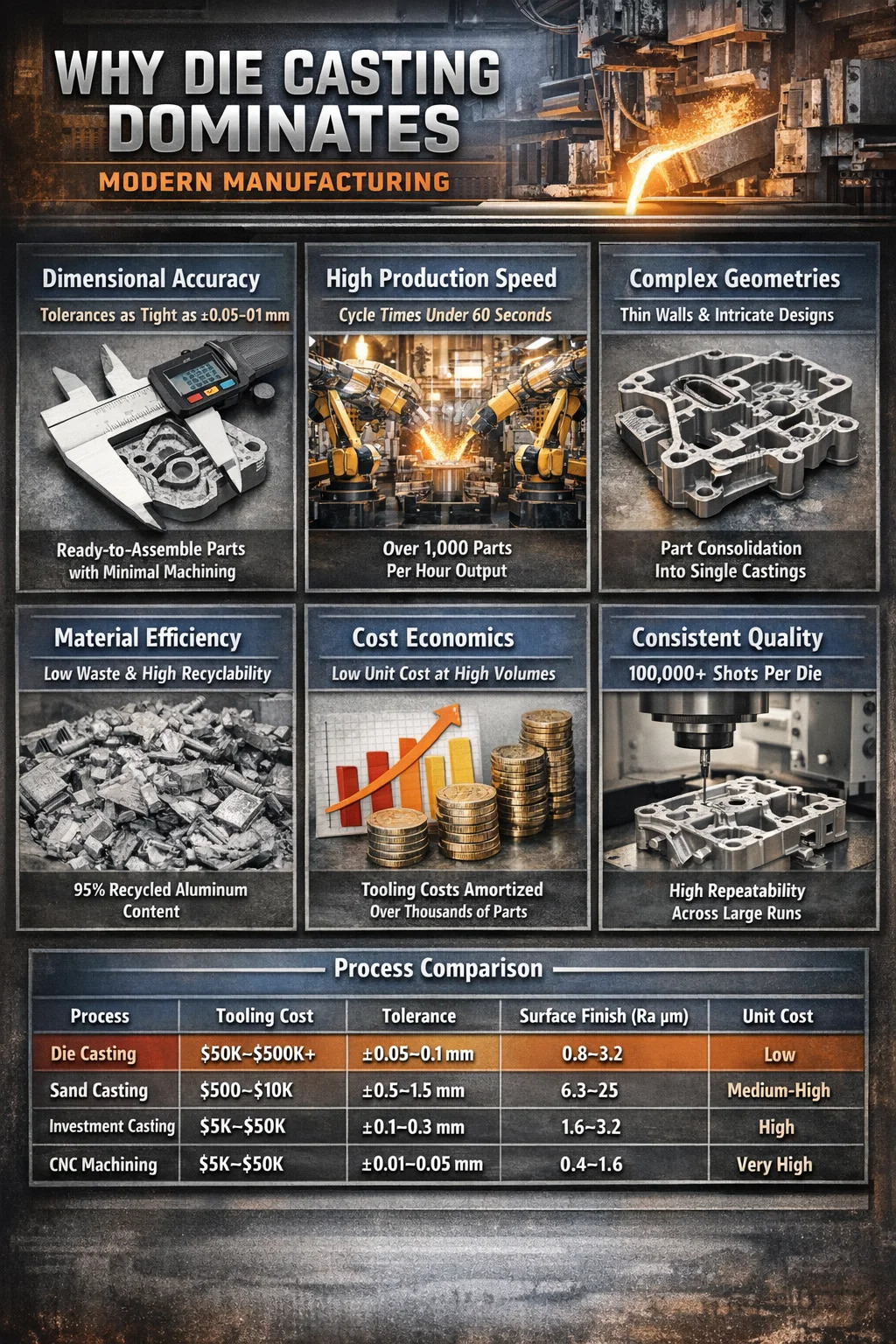 Tabellen illustrerer, hvor trykstøbning passer: det er ikke den billigste løsning til lave volumener, og den matcher ikke CNC-bearbejdning for ultimativ præcision. Men til produktion af komplekse dele i mellem til høj volumen, der kræver god nøjagtighed, glatte overflader og lave omkostninger pr. enhed, indtager den en position, som ingen anden proces fuldt ud kan erstatte.