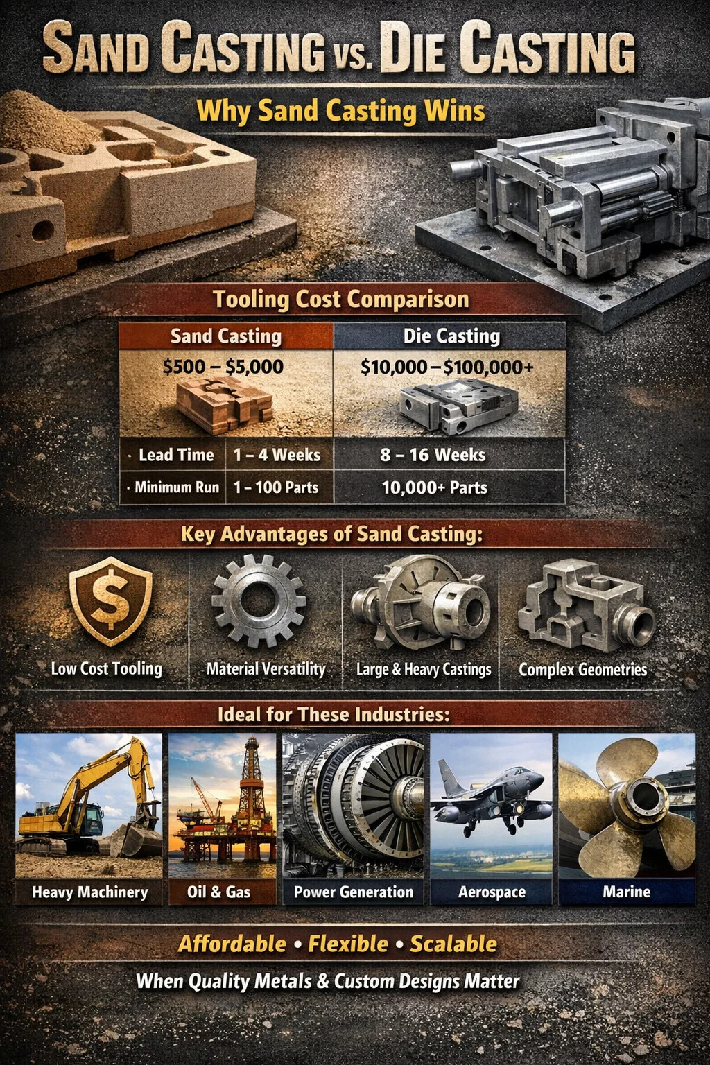 Det korte svar: Sandstøbning vinder på omkostninger, fleksibilitet og skala